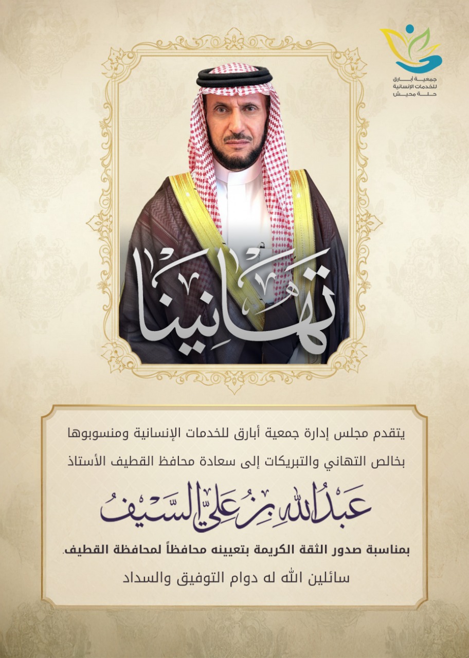 يتقدّم مجلس إدارة جمعية أبرق للخدمات الإنسانية ومنسوبوها بأسمى آيات التهاني والتبريكات إلى سعادة محافظ القطيف الأستاذ عبدالله بن علي السيف